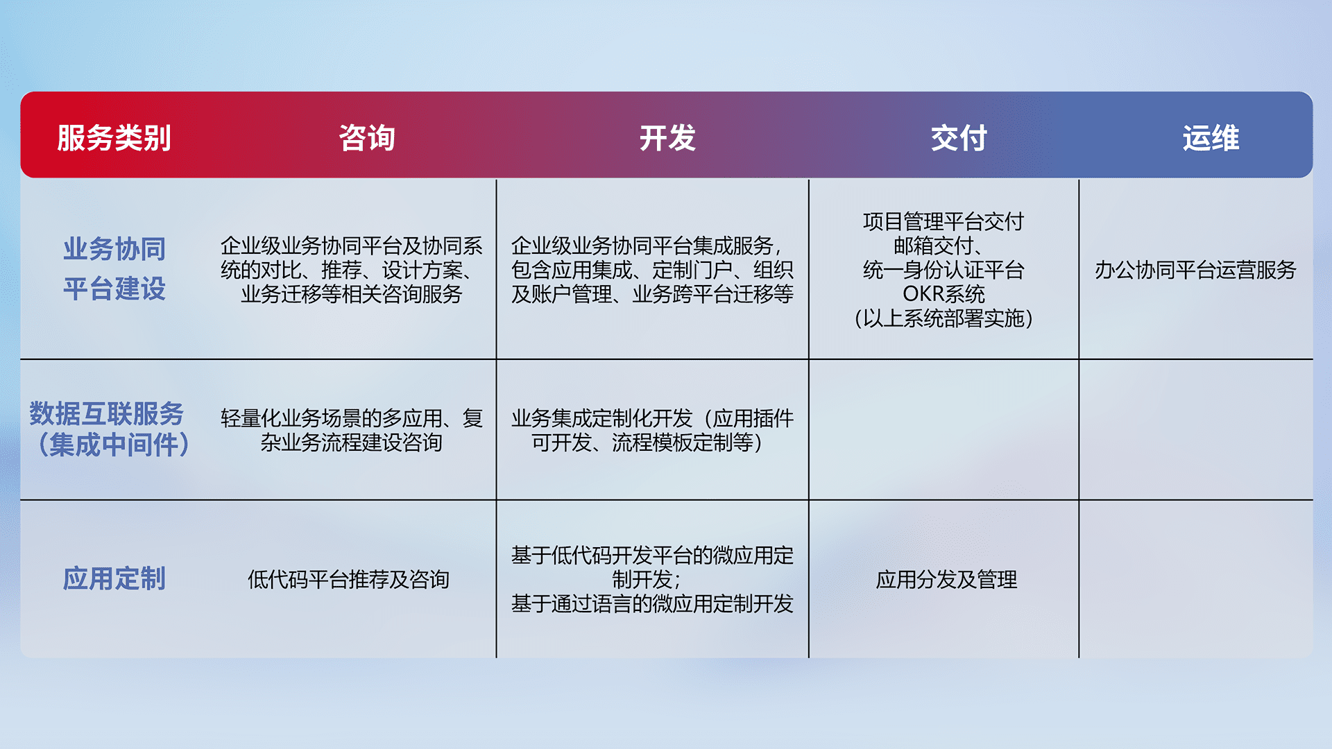 针对钉钉、、、、企微、、、IDaas等平台级产品提供产品的规划、、、、方案、、、交付、、、定制化开发等服务,,,实现如统一协同办公、、智能客户服务、、混合会议管理、、智能数据查询、、、、等业务场景,,,实现数字化转型。。。。