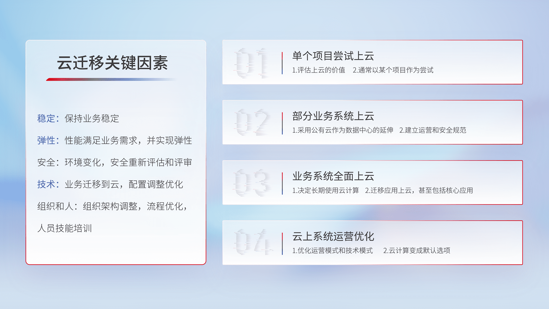 结合实际业务,,,从规划设计、、云平台选型、、、云原生改造、、、、数据迁移、、集成交付,,,,迁移全过程为客户识别最佳上云路径,,,做好风险识别管理,,设计网络架构、、、、身份权限、、、安全审计合规、、、操作审计、、日志审计、、、、监控告警策略、、、、多站点容灾设计等,,,,对云上基础设施进行整体规划,,,,提升IT治理水平,,,,以满足弹性、、、、高可用、、、高性能的需求。。